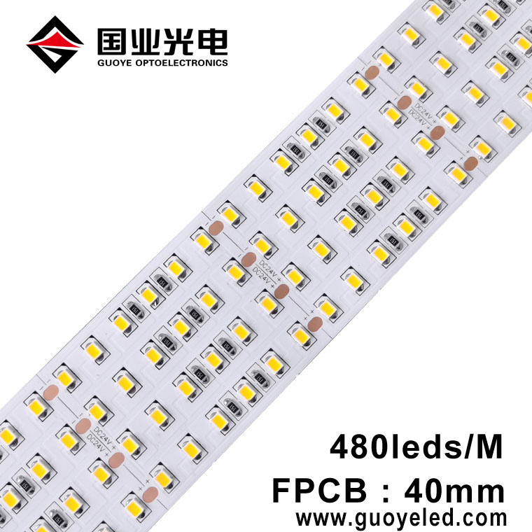 Tiras de led FPCB de 40 mm de largura usam placa de circuito de cobre eletrolítico de dupla face e 2835 lúmens SMD 480 peças por metro, a potência pode ser de 40 W a 60 watts por metro, O brilho, potência, temperatura de cor e CRI/RA podem ser personalizados.