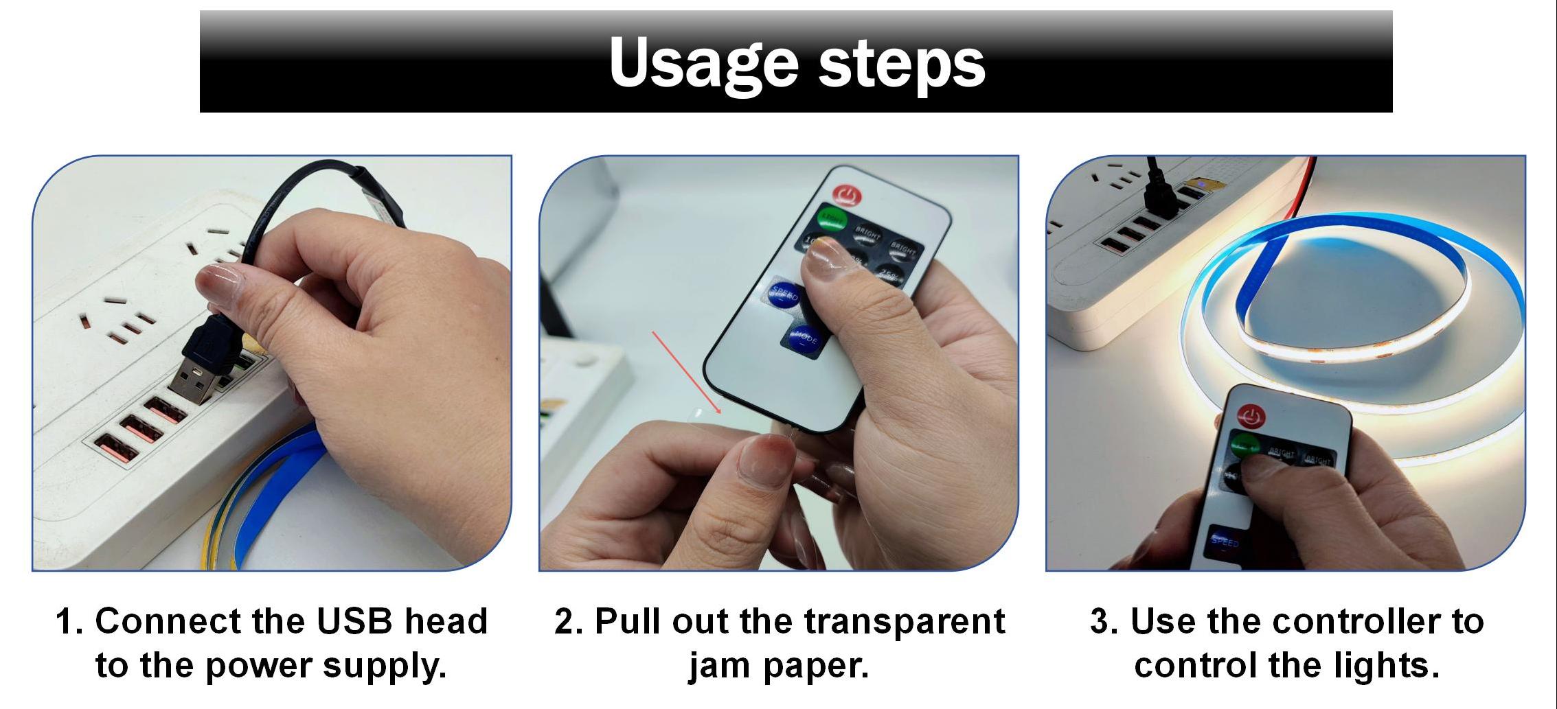 1.A faixa de luz é fácil de instalar. Isso é5V de baixa tensãorecurso e USBA interface facilita a conexão a um computador, fonte de alimentação móvel ou soquete USB.