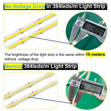 Por exemplo, suponha que a tensão de entrada da faixa da lâmpada seja de 12 volts, quando a corrente flui através de uma seção da faixa da lâmpada, a tensão pode cair para cerca de 10 volts longe da fonte de alimentação. Esta queda de tensão fará com que a tira leve fique significativamente mais escura em uma extremidade, longe da fonte de alimentação.